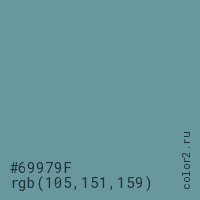 Цвет #69979F в цветовой модели RGB обозначается тремя октетами (105, 151, 159) в десятичном формате и #69979F в шестнадцатиричном (hex) формате, которые являются интенсивностью красного 105 (hex 69), интенсивность зелёного 151 (hex 97) и интенсивность синего 159 (hex 9F).