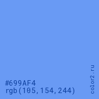 Цвет #699AF4 в цветовой модели RGB обозначается тремя октетами (105, 154, 244) в десятичном формате и #699AF4 в шестнадцатиричном (hex) формате, которые являются интенсивностью красного 105 (hex 69), интенсивность зелёного 154 (hex 9A) и интенсивность синего 244 (hex F4).