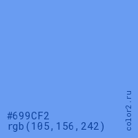 Цвет #699CF2 в цветовой модели RGB обозначается тремя октетами (105, 156, 242) в десятичном формате и #699CF2 в шестнадцатиричном (hex) формате, которые являются интенсивностью красного 105 (hex 69), интенсивность зелёного 156 (hex 9C) и интенсивность синего 242 (hex F2).