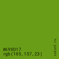 Цвет #699D17 в цветовой модели RGB обозначается тремя октетами (105, 157, 23) в десятичном формате и #699D17 в шестнадцатиричном (hex) формате, которые являются интенсивностью красного 105 (hex 69), интенсивность зелёного 157 (hex 9D) и интенсивность синего 23 (hex 17).