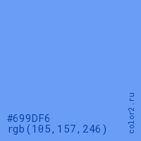 Цвет #699DF6 в цветовой модели RGB обозначается тремя октетами (105, 157, 246) в десятичном формате и #699DF6 в шестнадцатиричном (hex) формате, которые являются интенсивностью красного 105 (hex 69), интенсивность зелёного 157 (hex 9D) и интенсивность синего 246 (hex F6).