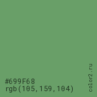 Цвет #699F68 в цветовой модели RGB обозначается тремя октетами (105, 159, 104) в десятичном формате и #699F68 в шестнадцатиричном (hex) формате, которые являются интенсивностью красного 105 (hex 69), интенсивность зелёного 159 (hex 9F) и интенсивность синего 104 (hex 68).