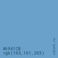 Цвет #69A1CB в цветовой модели RGB обозначается тремя октетами (105, 161, 203) в десятичном формате и #69A1CB в шестнадцатиричном (hex) формате, которые являются интенсивностью красного 105 (hex 69), интенсивность зелёного 161 (hex A1) и интенсивность синего 203 (hex CB).