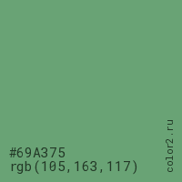 Цвет #69A375 в цветовой модели RGB обозначается тремя октетами (105, 163, 117) в десятичном формате и #69A375 в шестнадцатиричном (hex) формате, которые являются интенсивностью красного 105 (hex 69), интенсивность зелёного 163 (hex A3) и интенсивность синего 117 (hex 75).