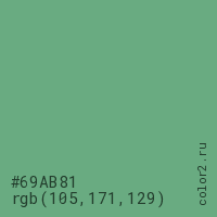 Цвет #69AB81 в цветовой модели RGB обозначается тремя октетами (105, 171, 129) в десятичном формате и #69AB81 в шестнадцатиричном (hex) формате, которые являются интенсивностью красного 105 (hex 69), интенсивность зелёного 171 (hex AB) и интенсивность синего 129 (hex 81).