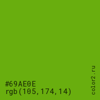 Цвет #69AE0E в цветовой модели RGB обозначается тремя октетами (105, 174, 14) в десятичном формате и #69AE0E в шестнадцатиричном (hex) формате, которые являются интенсивностью красного 105 (hex 69), интенсивность зелёного 174 (hex AE) и интенсивность синего 14 (hex 0E).