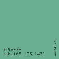 Цвет #69AF8F в цветовой модели RGB обозначается тремя октетами (105, 175, 143) в десятичном формате и #69AF8F в шестнадцатиричном (hex) формате, которые являются интенсивностью красного 105 (hex 69), интенсивность зелёного 175 (hex AF) и интенсивность синего 143 (hex 8F).