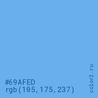Цвет #69AFED в цветовой модели RGB обозначается тремя октетами (105, 175, 237) в десятичном формате и #69AFED в шестнадцатиричном (hex) формате, которые являются интенсивностью красного 105 (hex 69), интенсивность зелёного 175 (hex AF) и интенсивность синего 237 (hex ED).