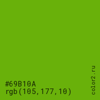 Цвет #69B10A в цветовой модели RGB обозначается тремя октетами (105, 177, 10) в десятичном формате и #69B10A в шестнадцатиричном (hex) формате, которые являются интенсивностью красного 105 (hex 69), интенсивность зелёного 177 (hex B1) и интенсивность синего 10 (hex 0A).