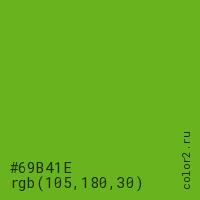 Цвет #69B41E в цветовой модели RGB обозначается тремя октетами (105, 180, 30) в десятичном формате и #69B41E в шестнадцатиричном (hex) формате, которые являются интенсивностью красного 105 (hex 69), интенсивность зелёного 180 (hex B4) и интенсивность синего 30 (hex 1E).