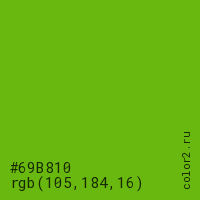 Цвет #69B810 в цветовой модели RGB обозначается тремя октетами (105, 184, 16) в десятичном формате и #69B810 в шестнадцатиричном (hex) формате, которые являются интенсивностью красного 105 (hex 69), интенсивность зелёного 184 (hex B8) и интенсивность синего 16 (hex 10).