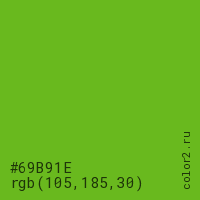 Цвет #69B91E в цветовой модели RGB обозначается тремя октетами (105, 185, 30) в десятичном формате и #69B91E в шестнадцатиричном (hex) формате, которые являются интенсивностью красного 105 (hex 69), интенсивность зелёного 185 (hex B9) и интенсивность синего 30 (hex 1E).