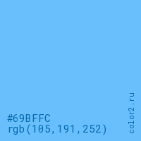 Цвет #69BFFC в цветовой модели RGB обозначается тремя октетами (105, 191, 252) в десятичном формате и #69BFFC в шестнадцатиричном (hex) формате, которые являются интенсивностью красного 105 (hex 69), интенсивность зелёного 191 (hex BF) и интенсивность синего 252 (hex FC).