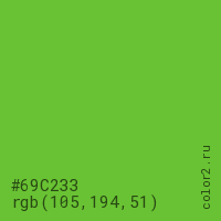 Цвет #69C233 в цветовой модели RGB обозначается тремя октетами (105, 194, 51) в десятичном формате и #69C233 в шестнадцатиричном (hex) формате, которые являются интенсивностью красного 105 (hex 69), интенсивность зелёного 194 (hex C2) и интенсивность синего 51 (hex 33).