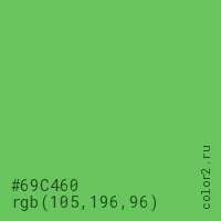 Цвет #69C460 в цветовой модели RGB обозначается тремя октетами (105, 196, 96) в десятичном формате и #69C460 в шестнадцатиричном (hex) формате, которые являются интенсивностью красного 105 (hex 69), интенсивность зелёного 196 (hex C4) и интенсивность синего 96 (hex 60).