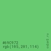Цвет #69C972 в цветовой модели RGB обозначается тремя октетами (105, 201, 114) в десятичном формате и #69C972 в шестнадцатиричном (hex) формате, которые являются интенсивностью красного 105 (hex 69), интенсивность зелёного 201 (hex C9) и интенсивность синего 114 (hex 72).