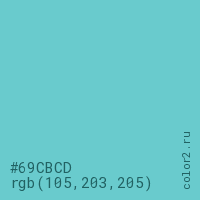 Цвет #69CBCD в цветовой модели RGB обозначается тремя октетами (105, 203, 205) в десятичном формате и #69CBCD в шестнадцатиричном (hex) формате, которые являются интенсивностью красного 105 (hex 69), интенсивность зелёного 203 (hex CB) и интенсивность синего 205 (hex CD).