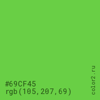 Цвет #69CF45 в цветовой модели RGB обозначается тремя октетами (105, 207, 69) в десятичном формате и #69CF45 в шестнадцатиричном (hex) формате, которые являются интенсивностью красного 105 (hex 69), интенсивность зелёного 207 (hex CF) и интенсивность синего 69 (hex 45).