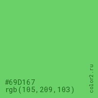 Цвет #69D167 в цветовой модели RGB обозначается тремя октетами (105, 209, 103) в десятичном формате и #69D167 в шестнадцатиричном (hex) формате, которые являются интенсивностью красного 105 (hex 69), интенсивность зелёного 209 (hex D1) и интенсивность синего 103 (hex 67).