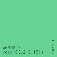 Цвет #69D297 в цветовой модели RGB обозначается тремя октетами (105, 210, 151) в десятичном формате и #69D297 в шестнадцатиричном (hex) формате, которые являются интенсивностью красного 105 (hex 69), интенсивность зелёного 210 (hex D2) и интенсивность синего 151 (hex 97).