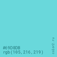 Цвет #69D8DB в цветовой модели RGB обозначается тремя октетами (105, 216, 219) в десятичном формате и #69D8DB в шестнадцатиричном (hex) формате, которые являются интенсивностью красного 105 (hex 69), интенсивность зелёного 216 (hex D8) и интенсивность синего 219 (hex DB).