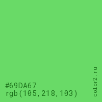 Цвет #69DA67 в цветовой модели RGB обозначается тремя октетами (105, 218, 103) в десятичном формате и #69DA67 в шестнадцатиричном (hex) формате, которые являются интенсивностью красного 105 (hex 69), интенсивность зелёного 218 (hex DA) и интенсивность синего 103 (hex 67).