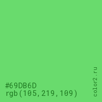 Цвет #69DB6D в цветовой модели RGB обозначается тремя октетами (105, 219, 109) в десятичном формате и #69DB6D в шестнадцатиричном (hex) формате, которые являются интенсивностью красного 105 (hex 69), интенсивность зелёного 219 (hex DB) и интенсивность синего 109 (hex 6D).
