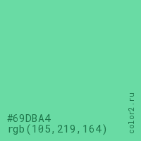 Цвет #69DBA4 в цветовой модели RGB обозначается тремя октетами (105, 219, 164) в десятичном формате и #69DBA4 в шестнадцатиричном (hex) формате, которые являются интенсивностью красного 105 (hex 69), интенсивность зелёного 219 (hex DB) и интенсивность синего 164 (hex A4).