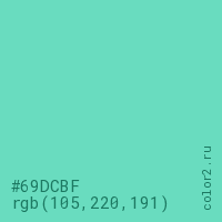 Цвет #69DCBF в цветовой модели RGB обозначается тремя октетами (105, 220, 191) в десятичном формате и #69DCBF в шестнадцатиричном (hex) формате, которые являются интенсивностью красного 105 (hex 69), интенсивность зелёного 220 (hex DC) и интенсивность синего 191 (hex BF).