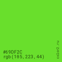 Цвет #69DF2C в цветовой модели RGB обозначается тремя октетами (105, 223, 44) в десятичном формате и #69DF2C в шестнадцатиричном (hex) формате, которые являются интенсивностью красного 105 (hex 69), интенсивность зелёного 223 (hex DF) и интенсивность синего 44 (hex 2C).