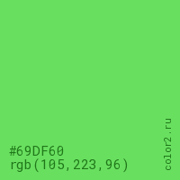 Цвет #69DF60 в цветовой модели RGB обозначается тремя октетами (105, 223, 96) в десятичном формате и #69DF60 в шестнадцатиричном (hex) формате, которые являются интенсивностью красного 105 (hex 69), интенсивность зелёного 223 (hex DF) и интенсивность синего 96 (hex 60).