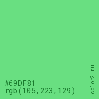 Цвет #69DF81 в цветовой модели RGB обозначается тремя октетами (105, 223, 129) в десятичном формате и #69DF81 в шестнадцатиричном (hex) формате, которые являются интенсивностью красного 105 (hex 69), интенсивность зелёного 223 (hex DF) и интенсивность синего 129 (hex 81).