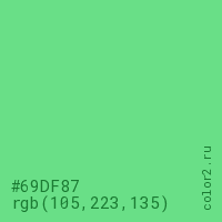 Цвет #69DF87 в цветовой модели RGB обозначается тремя октетами (105, 223, 135) в десятичном формате и #69DF87 в шестнадцатиричном (hex) формате, которые являются интенсивностью красного 105 (hex 69), интенсивность зелёного 223 (hex DF) и интенсивность синего 135 (hex 87).