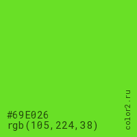 Цвет #69E026 в цветовой модели RGB обозначается тремя октетами (105, 224, 38) в десятичном формате и #69E026 в шестнадцатиричном (hex) формате, которые являются интенсивностью красного 105 (hex 69), интенсивность зелёного 224 (hex E0) и интенсивность синего 38 (hex 26).