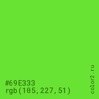 Цвет #69E333 в цветовой модели RGB обозначается тремя октетами (105, 227, 51) в десятичном формате и #69E333 в шестнадцатиричном (hex) формате, которые являются интенсивностью красного 105 (hex 69), интенсивность зелёного 227 (hex E3) и интенсивность синего 51 (hex 33).
