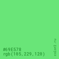 Цвет #69E578 в цветовой модели RGB обозначается тремя октетами (105, 229, 120) в десятичном формате и #69E578 в шестнадцатиричном (hex) формате, которые являются интенсивностью красного 105 (hex 69), интенсивность зелёного 229 (hex E5) и интенсивность синего 120 (hex 78).