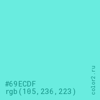 Цвет #69ECDF в цветовой модели RGB обозначается тремя октетами (105, 236, 223) в десятичном формате и #69ECDF в шестнадцатиричном (hex) формате, которые являются интенсивностью красного 105 (hex 69), интенсивность зелёного 236 (hex EC) и интенсивность синего 223 (hex DF).