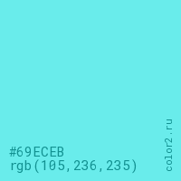 Цвет #69ECEB в цветовой модели RGB обозначается тремя октетами (105, 236, 235) в десятичном формате и #69ECEB в шестнадцатиричном (hex) формате, которые являются интенсивностью красного 105 (hex 69), интенсивность зелёного 236 (hex EC) и интенсивность синего 235 (hex EB).