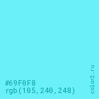 Цвет #69F0F8 в цветовой модели RGB обозначается тремя октетами (105, 240, 248) в десятичном формате и #69F0F8 в шестнадцатиричном (hex) формате, которые являются интенсивностью красного 105 (hex 69), интенсивность зелёного 240 (hex F0) и интенсивность синего 248 (hex F8).