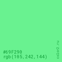 Цвет #69F290 в цветовой модели RGB обозначается тремя октетами (105, 242, 144) в десятичном формате и #69F290 в шестнадцатиричном (hex) формате, которые являются интенсивностью красного 105 (hex 69), интенсивность зелёного 242 (hex F2) и интенсивность синего 144 (hex 90).