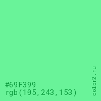 Цвет #69F399 в цветовой модели RGB обозначается тремя октетами (105, 243, 153) в десятичном формате и #69F399 в шестнадцатиричном (hex) формате, которые являются интенсивностью красного 105 (hex 69), интенсивность зелёного 243 (hex F3) и интенсивность синего 153 (hex 99).
