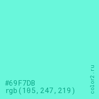 Цвет #69F7DB в цветовой модели RGB обозначается тремя октетами (105, 247, 219) в десятичном формате и #69F7DB в шестнадцатиричном (hex) формате, которые являются интенсивностью красного 105 (hex 69), интенсивность зелёного 247 (hex F7) и интенсивность синего 219 (hex DB).