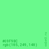 Цвет #69F98C в цветовой модели RGB обозначается тремя октетами (105, 249, 140) в десятичном формате и #69F98C в шестнадцатиричном (hex) формате, которые являются интенсивностью красного 105 (hex 69), интенсивность зелёного 249 (hex F9) и интенсивность синего 140 (hex 8C).