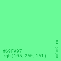 Цвет #69FA97 в цветовой модели RGB обозначается тремя октетами (105, 250, 151) в десятичном формате и #69FA97 в шестнадцатиричном (hex) формате, которые являются интенсивностью красного 105 (hex 69), интенсивность зелёного 250 (hex FA) и интенсивность синего 151 (hex 97).