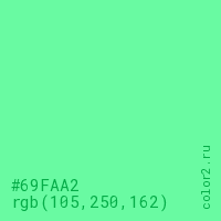 Цвет #69FAA2 в цветовой модели RGB обозначается тремя октетами (105, 250, 162) в десятичном формате и #69FAA2 в шестнадцатиричном (hex) формате, которые являются интенсивностью красного 105 (hex 69), интенсивность зелёного 250 (hex FA) и интенсивность синего 162 (hex A2).