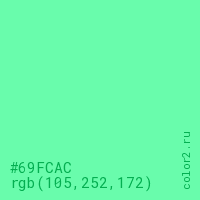 Цвет #69FCAC в цветовой модели RGB обозначается тремя октетами (105, 252, 172) в десятичном формате и #69FCAC в шестнадцатиричном (hex) формате, которые являются интенсивностью красного 105 (hex 69), интенсивность зелёного 252 (hex FC) и интенсивность синего 172 (hex AC).