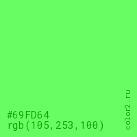 Цвет #69FD64 в цветовой модели RGB обозначается тремя октетами (105, 253, 100) в десятичном формате и #69FD64 в шестнадцатиричном (hex) формате, которые являются интенсивностью красного 105 (hex 69), интенсивность зелёного 253 (hex FD) и интенсивность синего 100 (hex 64).