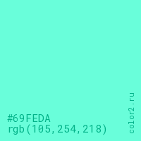 Цвет #69FEDA в цветовой модели RGB обозначается тремя октетами (105, 254, 218) в десятичном формате и #69FEDA в шестнадцатиричном (hex) формате, которые являются интенсивностью красного 105 (hex 69), интенсивность зелёного 254 (hex FE) и интенсивность синего 218 (hex DA).