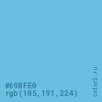 Цвет #69BFE0 в цветовой модели RGB обозначается тремя октетами (105, 191, 224) в десятичном формате и #69BFE0 в шестнадцатиричном (hex) формате, которые являются интенсивностью красного 105 (hex 69), интенсивность зелёного 191 (hex BF) и интенсивность синего 224 (hex E0).