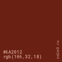 Цвет #6A2012 в цветовой модели RGB обозначается тремя октетами (106, 32, 18) в десятичном формате и #6A2012 в шестнадцатиричном (hex) формате, которые являются интенсивностью красного 106 (hex 6A), интенсивность зелёного 32 (hex 20) и интенсивность синего 18 (hex 12).